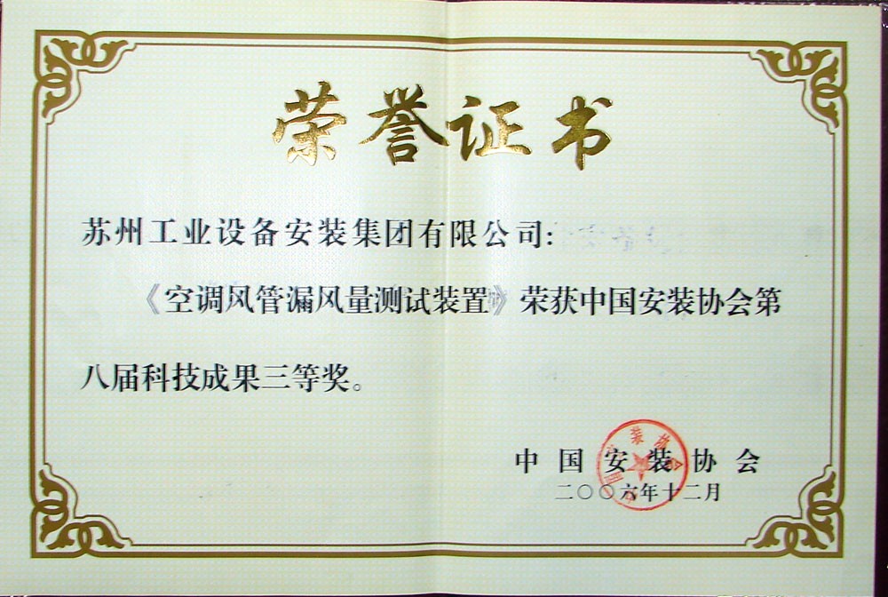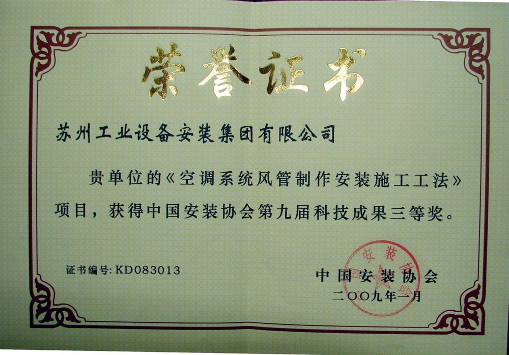 空调系统风管制作安装施工工法项目,获得中国安装协会第九届科技成果三等奖.